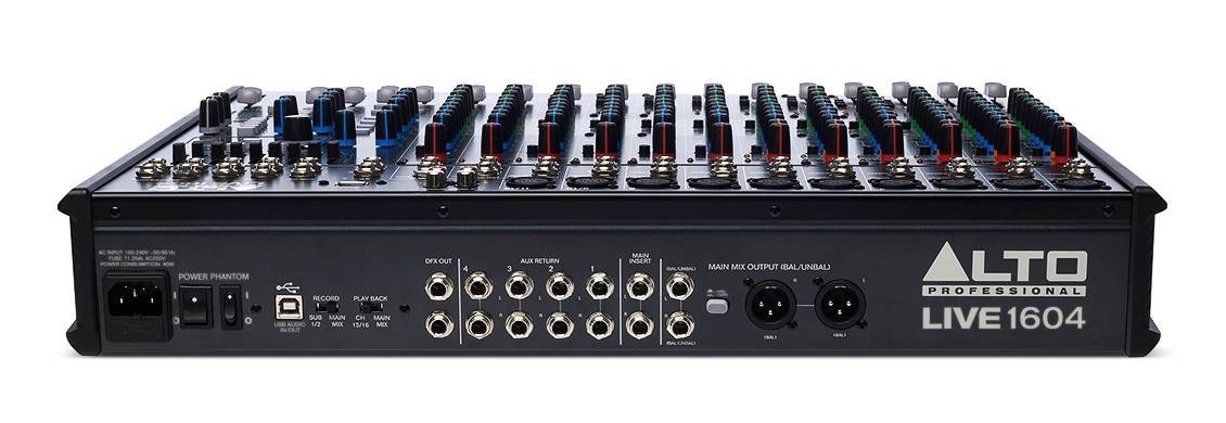 It features 10 balanced XLR inputs with switchable phantom power, 3-band EQs with sweepable mids for additional tonal shaping, four aux sends per-channel for external effects and monitoring, and a 9-band graphic EQ for main or monitor outputs. A headphone jack with an independent level control enables additional monitoring and mixing. 60mm faders with LED meters provide precise control and visual feedback for accurate, hands-on mixing. With its diverse connectivity options, Live 1604 can handle any sized event from small coffee house gigs to mid-sized ensembles to full-stage rock bands.